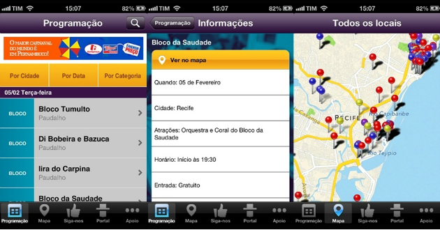 Para a região de Recife, o ideal é o “PE no Carnaval” (disponível na App Store e Google Play), que mostra a programação completa dos blocos pernambucanos. E para a cidade de Recife, existe ainda a opção do “Carnaval do Recife 2013” (disponível para iOS e Android), onde o folião pode consultar as opções de restaurantes, hospedagem e demais serviços, além da programação completa.