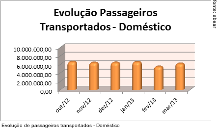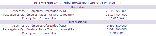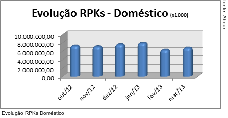 Março viu, ainda, um forte crescimento no tráfego internacional, da ordem de 9,5% sobre o mesmo mês de 2012. No ano passado haviam sido registrados pouco mais de 2,1 bilhões de RPKs, enquanto que em 2013 o número chegou a mais de 2,3 bilhões de RPKs. Nesse mercado houve, entretanto, acentuada queda no fator de aproveitamento, de 77,15% para 71,57%.