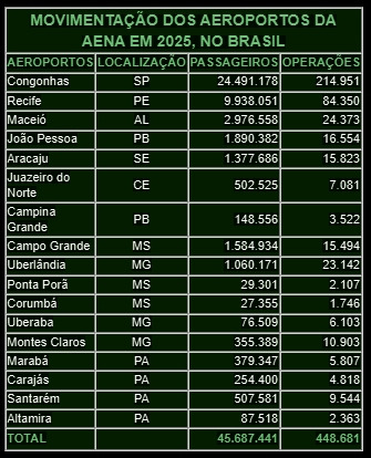 A Aena encerrou 2025 com recorde de passageiros em sua rede de aeroportos no país. Segundo dados divulgados pela concessionária, passaram pelos 17 terminais administrados pela concessionária 45,6 milhões de passageiros, crescimento de 5% em relação a 2024, consolidando a expansão da demanda aérea nos mercados atendidos pela companhia.