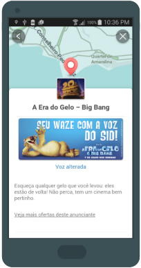 Com a marca recorde de R$ 230 milhões e cerca de 25 milhões de espectadores com os últimos lançamentos, a franquia de “A Era do Gelo” acumula a maior bilheteria em animação no Brasil. Agora, um dos maiores protagonistas de todos os tempos, Sid, na voz de Tadeu Mello, invade o Waze, aplicativo de navegação gratuita com a maior rede de motoristas do mundo, para assumir a locução dos trajetos. A iniciativa é realizada por meio da parceria entre a Fox Film do Brasil e o Waze, para celebrar a estreia do novo filme da série, “A Era do Gelo: O Big Bang”. Pelo acordo, os usuários poderão navegar de forma personalizada até 31 de agosto.