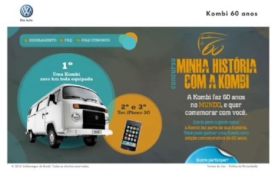 A Volkswagen celebrará os 60 anos de produção da Kombi no mundo oferecendo aos clientes o concurso público “Minha História com a Kombi”. A ativação criada pela Bullet premiará as três melhores histórias vivenciadas envolvendo uma Kombi. O primeiro colocado ganhará uma Kombi 0 km e os outros dois ganharão um iPhone 3G.