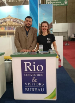 Na foto, durante a ABAV, Eric Boulanger, gerente de Congressos e Eventos do Rio CVB e Andréa Revoredo, assistente de Congressos e Turismo do Rio CVB.