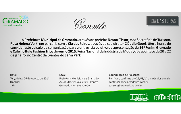 Os detalhes da próxima edição da Fenim Gramado serão apresentados em uma coletiva de imprensa no próximo dia 26 de agosto. A feira de moda têxtil ocorrerá de 20 a 22 de janeiro de 2015, nos pavilhões do Serra Park, em Gramado. A Prefeitura de Gramado e a Cia das Feiras, promotora do evento, receberão os convidados da mídia local na sede do Governo Municipal, a partir das 11h.