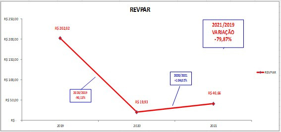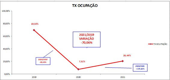 Embora a taxa média de ocupação tenha registrado 20,44% no mês de abril de 2021 e indique crescimento, quando comparada aos pífios 7,31% registrado em abril de 2020 – a mais baixa média de ocupação da série histórica – em relação ao ano de 2019, pré-pandemia, representa queda real de ocupação correspondente a 70,06%.