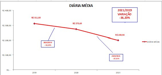 Além da receita advinda das diárias, a taxa média de ocupação pré-pandemia, apurada no mês de abril (69,53%) para a hotelaria no Estado de São Paulo incluía o faturamento decorrente de receitas com eventos, alimentos, bebidas e outros serviços prestados.