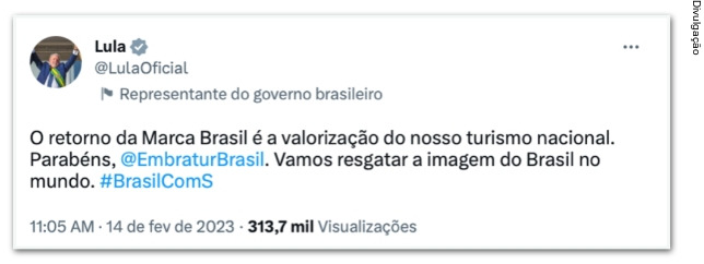 O presidente Luiz Inácio Lula da Silva se posicionou pelo Twitter: "O retorno da Marca Brasil é a valorização do nosso turismo nacional. Parabéns, @EmbraturBrasil. Vamos resgatar a imagem do Brasil no mundo".