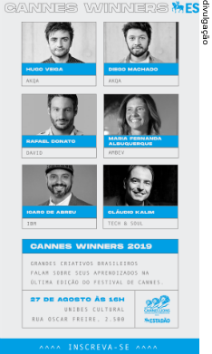 Com realização do Estadão, representante oficial do Cannes Lions no Brasil e organização da PS Carneiro, a última e derradeira etapa do Cannes Lions, o Cannes Winners, acontece em São Paulo no dia 27 de agosto, no auditório Unibes Cultural. O objetivo do evento é apresentar os trabalhos mais criativos e inovadores premiados no festival e destacar a inspiração dos contemplados profissionais da área de comunicação e marketing presentes nessa edição. Este ano, o Brasil levou 85 prêmios e ficou em terceiro lugar no número de leões. Em primeiro ficou Estados Unidos, com 313 do total de 932 estatuetas distribuídas, e em segundo o Reino Unido, com 90 “ferinhas”.
