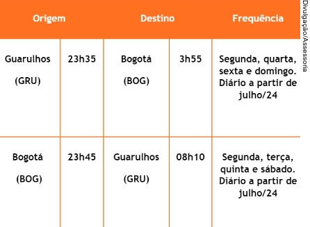 A operação entre o aeroporto internacional de São Paulo e a capital colombiana terá início a partir de 31 de março de 2024, com partida às 23h35 e chegada às 3h50, hora local (duas horas a menos do que o horário de Brasília). O retorno tem decolagem prevista do aeroporto El Dorado, em Bogotá, às 23h55, com pouso na Grande São Paulo às 8h20. Inicialmente serão 4 frequências semanais, passando a ser diárias em julho de 2024.