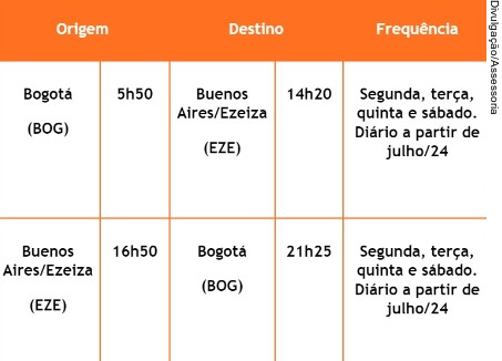 Para além da conexão entre os aeroportos internacionais de Bogotá e Guarulhos, a GOL também terá voos diretos entre a Colômbia e a Argentina. As operações sem escalas de Bogotá para Buenos Aires se iniciam em 1º de abril, com decolagens da capital colombiana às 5h50, chegando a Ezeiza às 14h20. O retorno acontece com saída às 16h50 e pouso planejado no aeroporto El Dorado, em Bogotá, às 21h25.