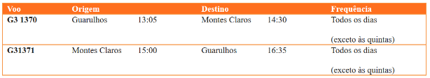 · GUARULHOS - MONTES CLAROS (MG): A nova rota iniciou no dia 31 de março e a companhia é a única empresa aérea a realizar voos diretos de São Paulo para a cidade mineira.