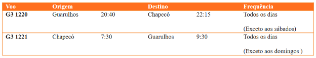· GUARULHOS - CHAPECÓ (SC): Esta rota é atualmente operada com exclusividade pela GOL, e a partir de 6 de maio, passa de duas operações para três.