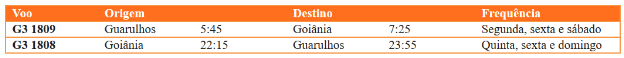 · GUARULHOS - GOIÂNIA (GO): A partir de 30 de junho, a companhia passa a ter 4 opções de voos diretos para Goiânia partindo do aeroporto de Guarulhos.