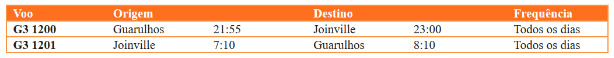 · GUARULHOS – JOINVILLE (SC): Com início em 5 de agosto, a rota será operada exclusivamente pela GOL com saídas deste aeroporto.