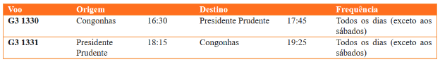 · CONGONHAS - PRESIDENTE PRUDENTE (SP): A partir de 2 de junho, a GOL passa a ter três voos entre as cidades com uma operação durante o período da tarde.