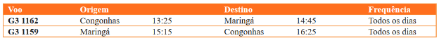 · CONGONHAS - MARINGÁ (PR): Com o novo voo, que inicia em 1° de julho, a companhia amplia de três para quatro voos diários a rota que já é oferecida exclusivamente pela GOL.
