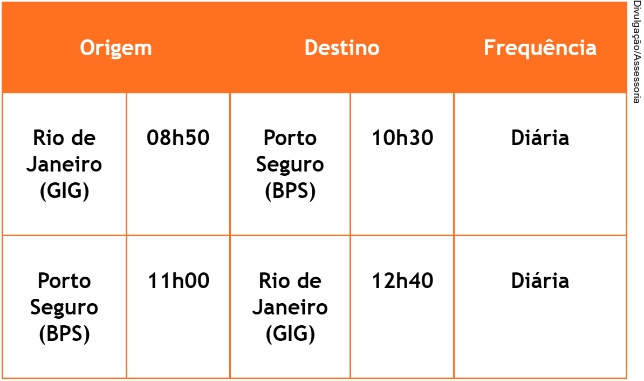 No último dia 4 de agosto, a GOL iniciou seus voos regulares, diretos e diários para Porto Seguro (BPS) a partir de GIG, permitindo aos Clientes o acesso rápido e cômodo às paisagens paradisíacas do litoral sul da Bahia, como as de Arraial d’Ajuda, Santa Cruz Cabrália, Caraíva, Trancoso e Praia do Espelho, entre outros. Com o lançamento do novo destino, são 32 opções domésticas e internacionais à disposição dos passageiros na capital fluminense, atendidas sem escalas pela Companhia [veja tabela abaixo com frequências e horários dos voos para Porto Seguro].