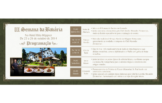“É a segunda vez que a Semana de Especialidades da Cozinha Bávara é realizada em nosso Restaurante. No ano passado, contamos com a presença do Príncipe "Heinrich Prinz von Bayern" da Baviera. Foi uma grande honra para nossa família e para Gramado”, ressalta. O evento gastronômico é realizado numa parceria entre o Hotel Ritta Höppner, a Associação Rota Romântica, e Neuschwanstein Hotels & Events, da Alemanha. Mais informações, por meio de reservas@minimundo.com.br ou pelo telefone 54-3286 13 34.