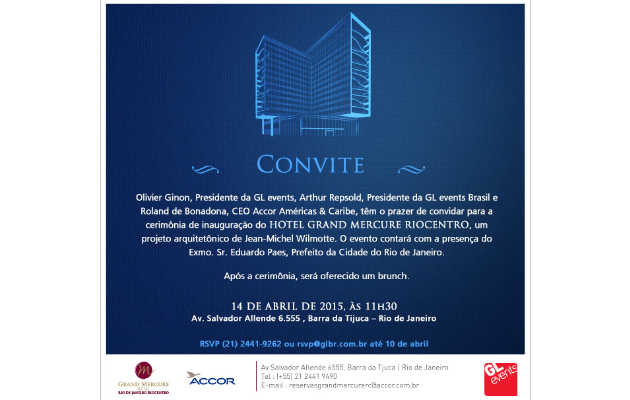 A GL events Brasil, braço da multinacional francesa GL events, convida para a inauguração do Grand Mercure Riocentro, o primeiro empreendimento do grupo no setor hoteleiro em todo mundo. A cerimônia terá a presença do prefeito do Rio de Janeiro, Eduardo Paes; do CEO mundial da GL events, Oliver Ginon; e do CEO Américas e Caribe do Grupo Accor, Roland de Bonadona, e do arquiteto responsável pelo projeto, Jean Michel Wilmotte.