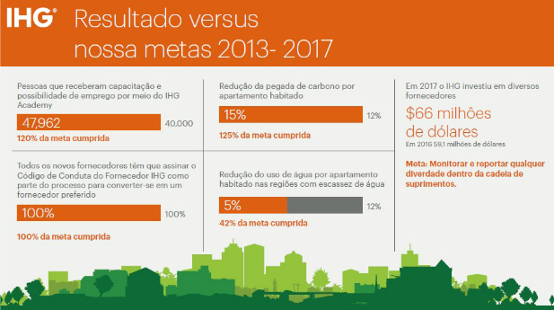Obtivemos bons resultados em comparação com nossas metas de 2013-2017. Fizemos progressos importantes em diferentes áreas, como a redução do uso de carbono e água em todos os nossos Hotéis, e treinamento de milhares de pessoas que vivem nas comunidades locais ao redor deles. Também obtivemos reconhecimento externo significativo para nossos esforços, que incluíram ser premiados como líder da indústria em sustentabilidade nos S&P Dow Jones Sustainability Índices 2017 - o mais prestigiado padrão de comparação global em termos de desempenho econômico corporativo, ambiental e social.