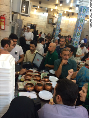 Movimento de pessoas, e motos, no Gran Bazzar de TeerãAchei aqui apenas 3 restaurantes e não muito grandes. Estes restaurantes servem, aproximadamente, 1 milhão de pratos por dia. Sim, 1 milhão de pratos no almoço. Então, se prepare para esperar a mesa, e participar de um verdadeiro ritual. As pessoas param atrás daquelas que já estão sentadas e comendo, como uma forma de pressão para que saiam logo. Neste momento, parece que alguém vai se agarrar na porrada e passar na frente do outro. Que nada. É de impressionar e ter paciência. E, ninguém demora muito mesmo, todos vão ali apenas para almoçar. Assim que você se senta, vem a comida e, claro, alguém já se colocou às suas costas te lembrando que é preciso ser rápido.