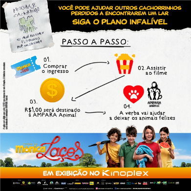 Nesta sexta (12 de julho), os espectadores que assistirem ao filme “Turma da Mônica – Laços” na rede Kinoplex estarão ajudando a mudar a realidade dos animais abandonados no Brasil. A cada ingresso comprado para o filme neste dia, R$ 1 será destinado à AMPARA Animal. A instituição, que auxilia mais de 450 abrigos no país com um sistema de rodízio de ração, medicamentos, vacinas, atendimento veterinário e eventos de adoção, beneficia mensalmente cerca de 10 mil animais pelo Brasil. A ação é uma parceria exclusiva entre a rede Kinoplex, a distribuidora Paris Filmes e a Mauricio de Sousa Produções (MSP).