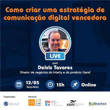 Com uma rede de parceiros muito bem estruturada e de alta relevância em seus mercados, o iSend traz para vocês mais uma LIVE que está se consolidando como um conteúdo de altíssimo interesse e com informações de grande impacto para que seus expectadores possam criar uma ESTRATÉGIA DE COMUNICAÇÃO DIGITAL TOTALMENTE VENCEDORA, permitindo o aprendizado de técnicas para a total migração de seus negócios e distribuição de conteúdo para o meio digital, tão relevante e necessário ao momento atual de toda a nossa economia.