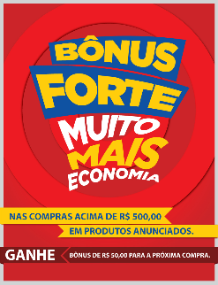 Já nas lojas de Minas Gerais e Ribeirão Preto, acontece a promoção “Bônus Forte, Muito mais Economia”. Os clientes gastam acima de R$ 500,00 em produtos anunciados e ganham um bônus de R$ 50,00 para a próxima compra.