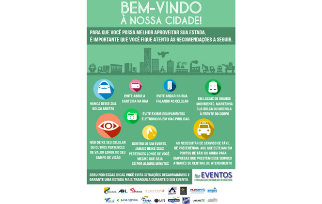 O material contém oito recomendações, que vão desde cuidados básicos com pertences, como bolsas, carteiras e aparelhos eletrônicos, até a orientação sobre o uso de serviços de táxi. “São dicas essenciais, selecionadas sob a aprovação das entidades participantes do Fórum, que poderão evitar transtornos ao visitante. Ainda que pareçam óbvias, a desatenção com um ou mais desses itens é a principal causa de furtos durante os eventos”, afirma a diretora executiva da Ampro, Mônica Schiaschio.