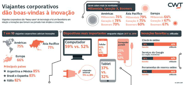 Pesquisa realizada pela CWT, empresa de gestão de viagens B2B4E (Business to Business for Employees), mostra que 71% dos viajantes a negócios em todo o mundo buscam adotar a inovação tecnológica em suas viagens. Os viajantes das Américas e da região Ásia-Pacífico são os mais propensos à utilização de novidades, com 75% e 71%, respectivamente. Os europeus, por outro lado, são mais cautelosos com as mudanças – 7% deles relutam em adotar a inovação em viagens, contra 5% da Ásia-Pacífico e 3% dos viajantes das Américas. No Brasil, 83% dos viajantes dizem estar abertos à inovação durante uma viagem a trabalho.