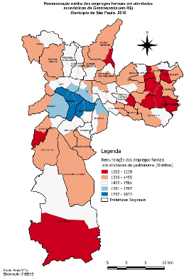 No caso das remunerações, a média de salários é maior em bairros como Moema (R$ 1.833), Pinheiros (R$ 1.764) e Itaim Bibi (R$ 1.762). Os valores maios baixos aparecem em Jaçanã (R$ 1.203), José Bonifácio (R$ 1.230) e Cidade Tiradentes (R$ 1.237).