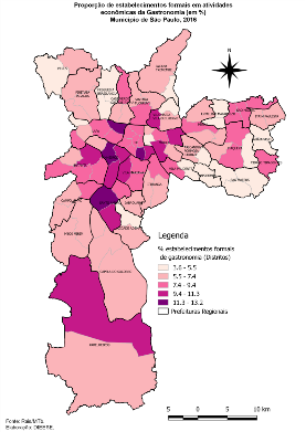 Já em relação à proporção de empregos relacionados à gastronomia, os bairros de Moema e Aricanduva (12,1%) se destacam seguidos por Vila Andrade e Pinheiros (11,5%).