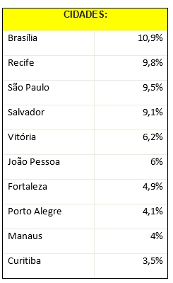 Dentre as cidades que mais procuraram o Rio de Janeiro para o final de semana do jogo, figuram, além de Brasília, Recife e São Paulo, outras três capitais nordestinas: Salvador, em quarto, com 9,1%; João Pessoa, em sexto, com 6%; e Fortaleza, em sétimo, com 4,9%. Ainda aparecem Vitória em quinto, com 6,2%, além de Porto Alegre, Manaus e Curitiba, que ocupam o oitavo, nono e décimo lugares.