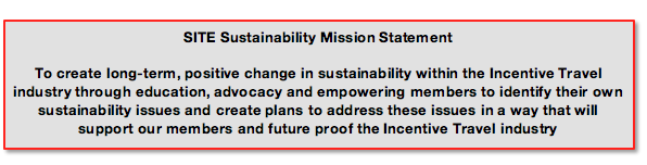 No início de 2018, a presidente da SITE, Annamaria Ruffini, anunciou uma nova prioridade estratégica: Sustentabilidade na Indústria de Viagens de Incentivo. "A sustentabilidade não é mais apenas algo "agradável de se ter" para as empresas em nosso espaço", comentou Annamaria. "É uma parte essencial de nossa oferta de serviços para clientes e necessidades da SITE (Society for Incentive Travel Excellence) para mostrar liderança na demonstração do valor que os acionistas da empresa precisam ver. Estou muito feliz em ter a Sustentabilidade como foco para a SITE em 2018 e além", acrescentou.