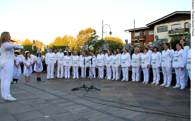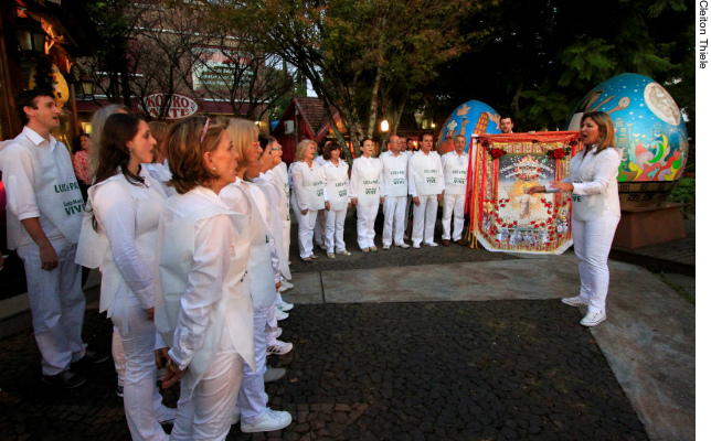 Um dia após o encerramento do inquérito que conduziu a investigação sobre as 241 vítimas do incêndio na Boate Kiss, em Santa Maria, no final de janeiro, representantes da cidade mostraram sua força em busca de paz e amor, em uma apresentação com cerca de 50 vozes do Coral Giuseppe Verdi, no final da tarde deste sábado (23), em frente à Igreja Matriz São Pedro. Como parte da programação do Chocofest – Páscoa em Gramado, a maestrina Enira Trindade conduziu o grupo com músicas que entoavam a esperança e a motivação para as pessoas que perderam familiares e amigos no acidente.