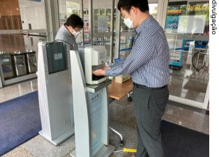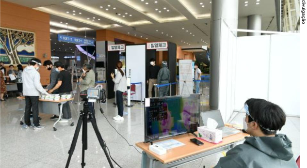 – Tapetes de desinfecção, câmeras de imagem térmica e termômetros de reconhecimento facial na entrada do pavilhão
