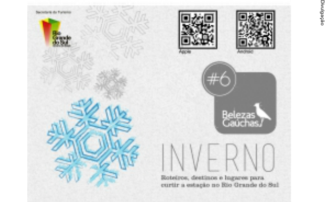 A Secretaria Estadual do Turismo (Setur), por meio do Departamento de Promoção e Marketing, divulga o QR Code para tablets e smartphones (Apple e Android) do aplicativo Belezas Gaúchas - Edição Inverno, com dicas, informações e atrações do turismo para aproveitar as baixas temperaturas da estação no Rio Grande do Sul.
