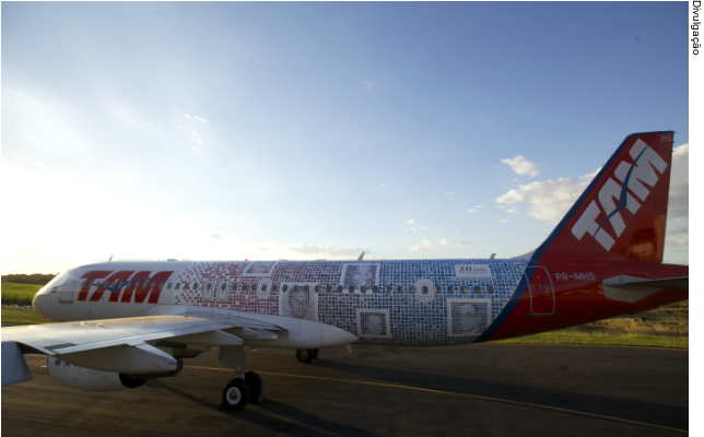 A empresa realizou no último domingo o primeiro voo de seu Airbus A320 coberto com um mosaico de 10 mil fotografias de clientes e fãs da marca. O voo inaugural da aeronave totalmente repaginada foi realizado na rota entre São Paulo/Congonhas e Curitiba. O trabalho de fixação das imagens na fuselagem integra uma ação especial para celebrar o aniversário de 20 anos do programa TAM Fidelidade. A campanha foi criada pela agência Wunderman, que convidou as pessoas a enviarem as fotos por meio do Facebook.