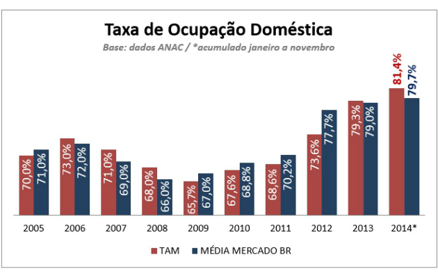 No mercado doméstico durante 2014, a TAM já registra load factor anual de 81,4%, enquanto a média do setor se situa em 79,7%. Os dados oficiais consideram o acumulado do setor até novembro, já que a ANAC ainda não divulgou os dados de dezembro do último ano.