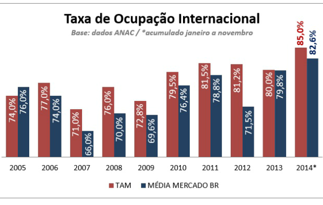 O avanço da ocupação internacional da TAM, que considera os voos de companhias brasileiras operados ao exterior, é regular e acima da média do setor desde 2006. No entanto, o índice de 2014 é o maior registrado pela companhia nos últimos 10 anos.