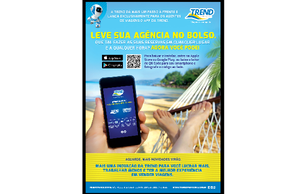 O departamento de marketing da TREND criou toda a iconografia e implantou um QR Code inteligente que vem estampado em todas as peças da campanha de divulgação. O sistema reconhece o dispositivo que o usuário utilizou para fotografar o código e faz o direcionamento para a Apple Store ou para o Google Play, economizando ainda mais o precioso tempo do agente de viagens.