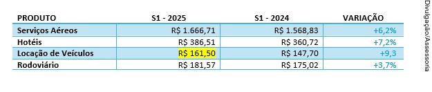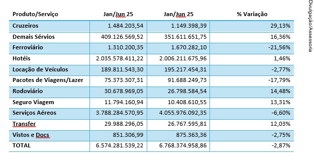 Os destaques positivos no primeiro semestre deste ano foram hotéis e rodoviário, que juntos representam quase 32% de todo o faturamento do período. O segmento rodoviário, por exemplo, fechou com R$ 30,6 milhões nos primeiros seis meses, contra R$ 26,7 milhões no ano passado, quase 15% acima. Já nos hotéis, o faturamento foi ligeiramente superior, com R$ 2,035 bilhões, 1,5% superior aos R$ 2,006 bilhões em igual período de 2024.