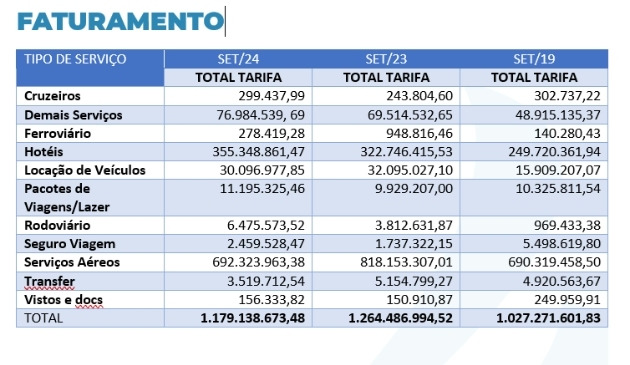 Hotéis continua em destaque, com faturamento em setembro de R$ 355 milhões, acima dos R$ 322 milhões no ano passado e dos R$ 249 milhões em 2019. Locação de veículos faturou R$ 30 milhões, quase o dobro de 2019, porém ficou um pouco abaixo de 2023, com R$ 32 milhões.
