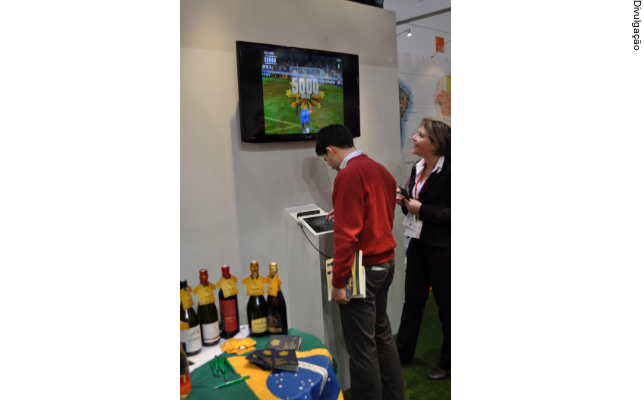 O estande de 102m² que remete a um estádio está alinhado com a ação promocional que premiará participantes com viagem ao Brasil, com direito a ingressos para o jogo de abertura da Copa das Confederações. Estão defendendo o terroir brasileiro as vinícolas Aurora, Casa Valduga, Domno do Brasil, Garibaldi, Lidio Carraro, Miolo, Pizzato, Salton e ViniBrasil.